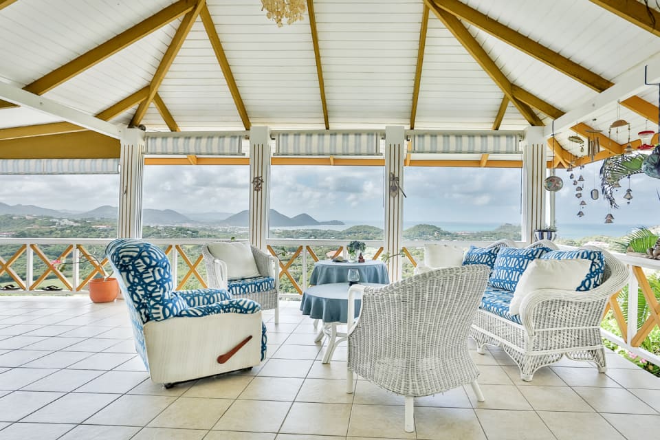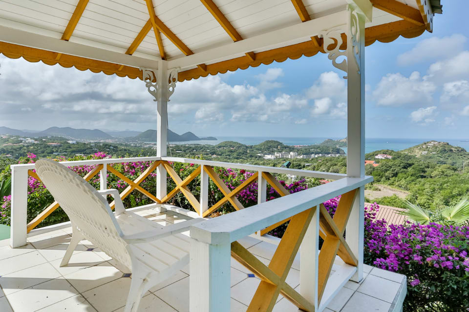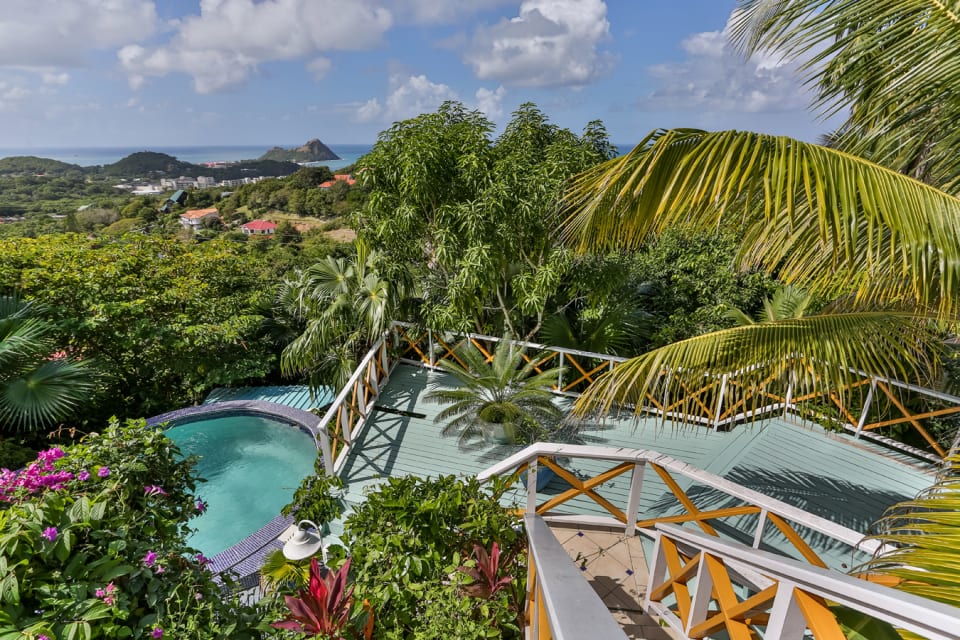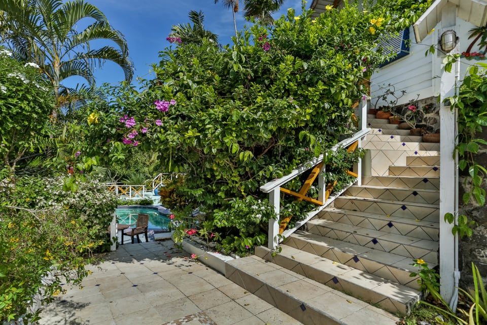 On the lower level of the home is a kidney shaped swimming pool with a lovely wooden deck that overlooks the panoramic landscape. The best way to enjoy Moonsong is to continue along the path from the pool along the garden path and relax at the gazebo which is uniquely placed to enjoy the bold blue waters and/or the twinkling lights around the northern island and even Martinique.