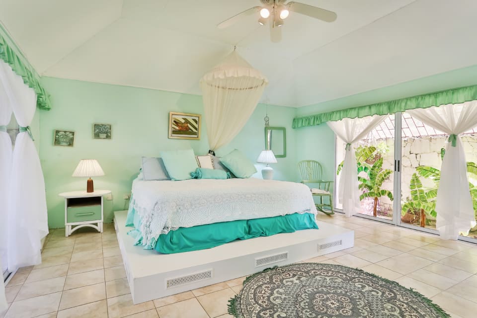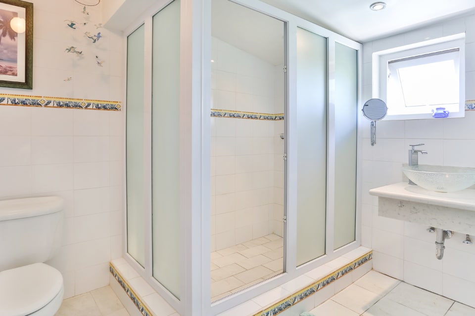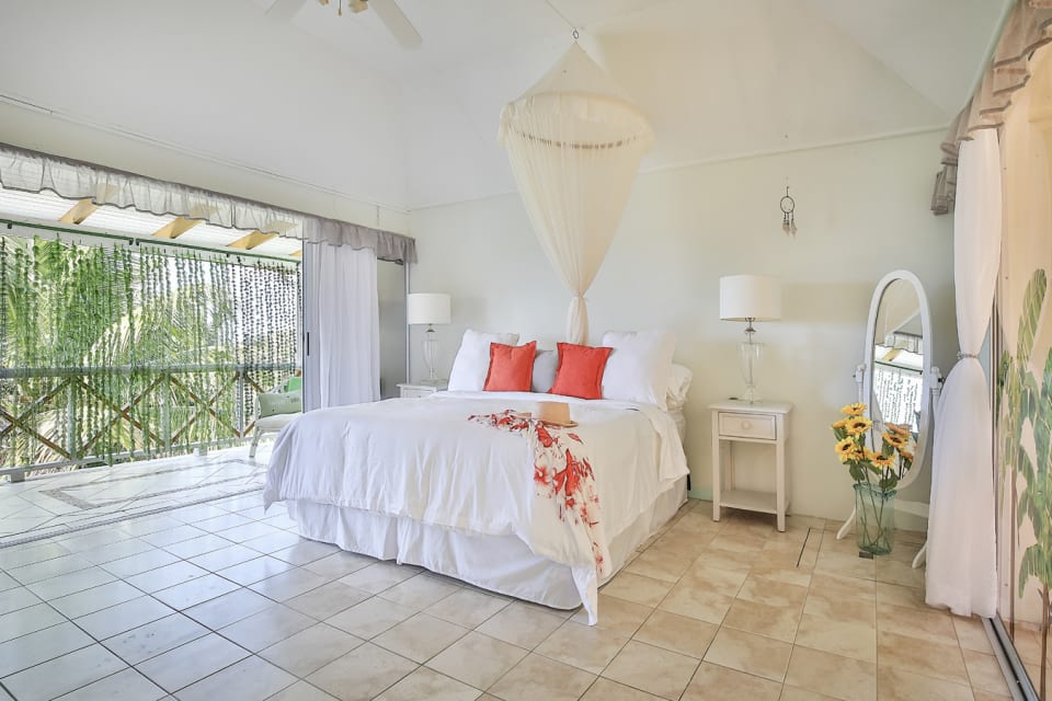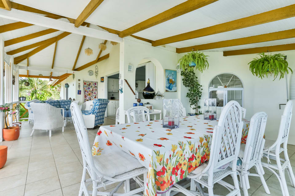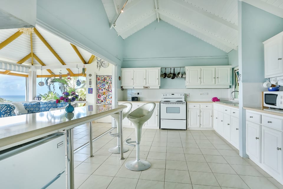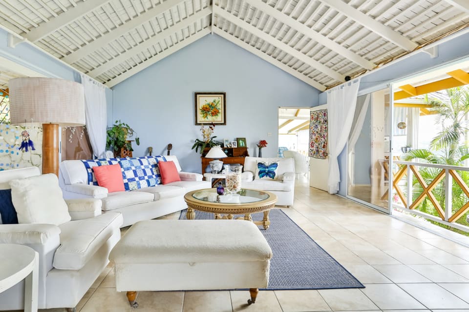From the main driveway, tiled stairs lead up to the main house and one is welcomed by through the foyer. On the left of the foyer are the two bedrooms , both with access to the balcony that overlook the vista. On the other side is the living room and a statement kitchen which was built to take in the bold views of The Caribbean Sea & beyond. Unique to this home is the outdoor dining room which forms part of the balcony. Separate from the main house is a studio guest cottage that is at the entrance near the parking area.