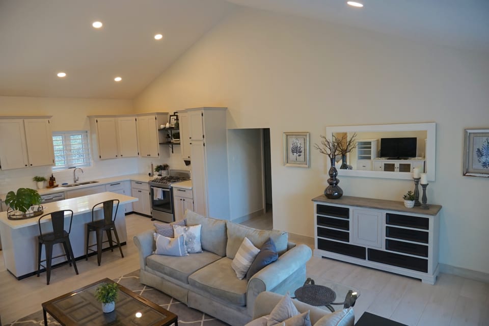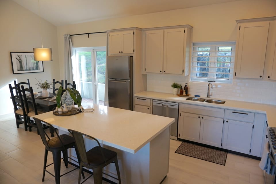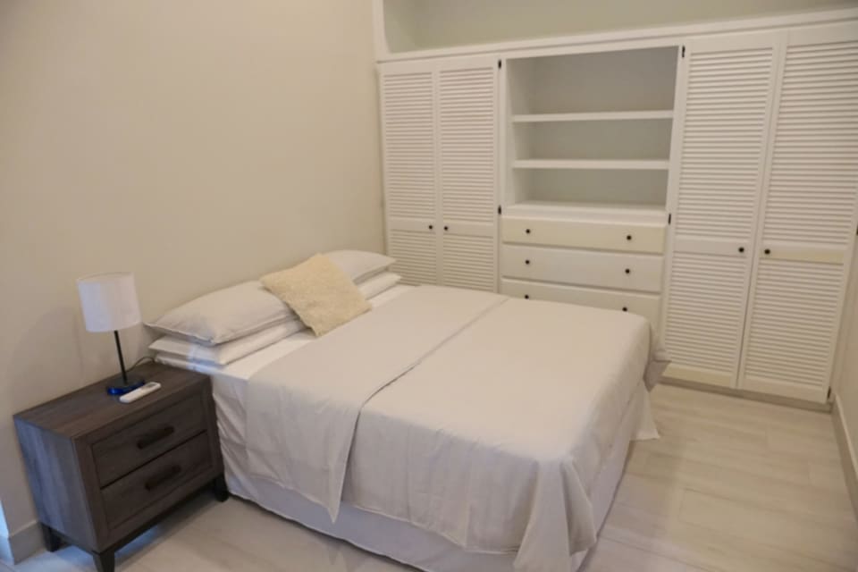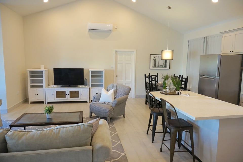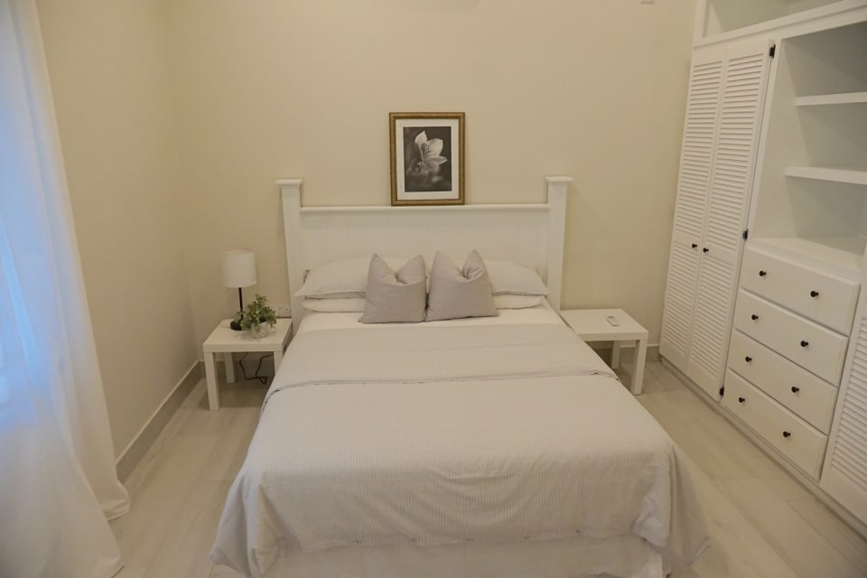 The layout of the house is quite functional, starting with a spacious living room accessed by a large sliding door entrance via a covered front balcony. The living room connects easily to an open dining area, which is an extension of the ample sized kitchen. The kitchen features a sizeable island counter and is fully equipped, with a convenient side exit accessing the back garden. Of the 3 bedrooms, the roomy master has an en-suite bathroom with a shower and double vanity. Added features of the master bedroom are a sizeable walk-in closet, and large windows allowing a generous flow of light and air into the room. The other two bedrooms are somewhat smaller, but can each fit a double or queen-sized bed easily. All bedroom and other windows are equipped with security bars and insect screens.